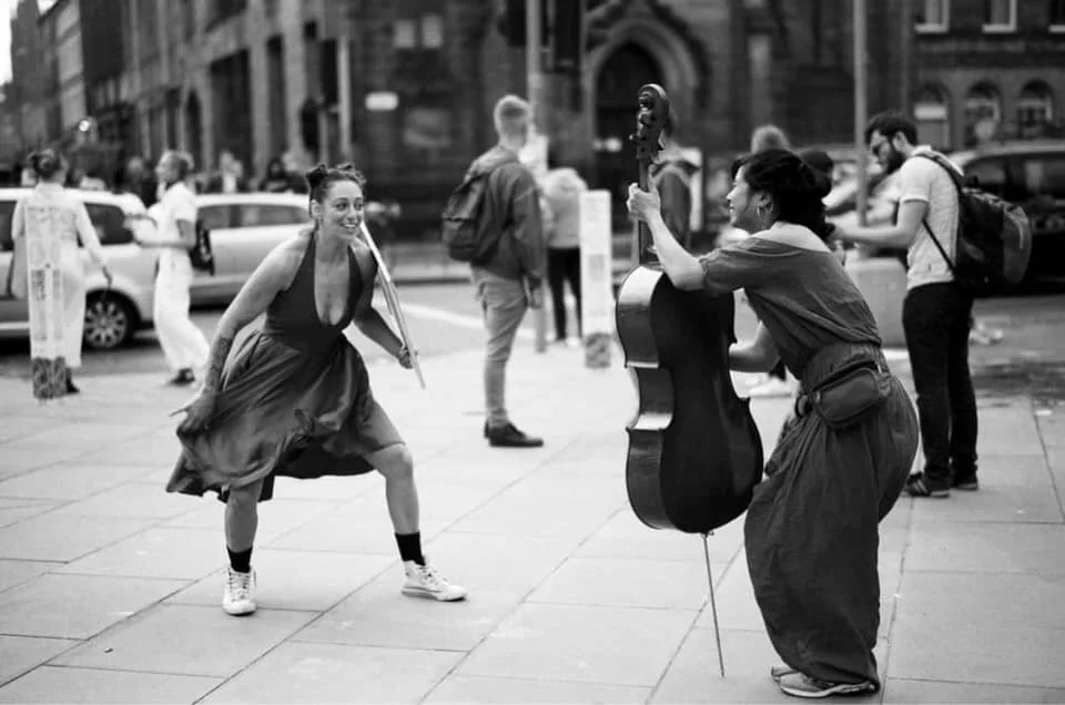 The adventures of Mel and Charles took flight during their four years at Wesleyan University. Lured in by the contagious and electric energy of the artistic community, the pair found their way into collaborations with dancers, visual artists, rappers, poets, actors and filmmakers. [As an act of defiance against her high school band director, Mel worked her way into Wesleyan's jazz orchestra, first by distorting Charles through an amp to sound more like a saxophone, and then eventually by picking up the double bass --or rather, "the big cello."]